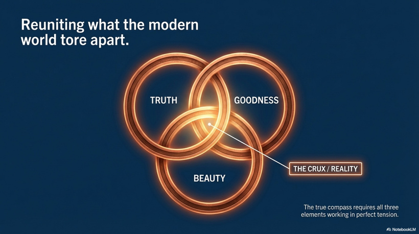 The fullness of truth integrates what philosophers call the Transcendentals — three properties that belong to all being: Truth, Goodness, and Beauty. Dr. Peter Kreeft puts it plainly: