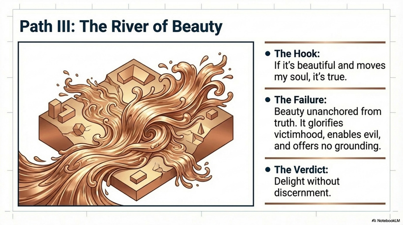 • Beauty without truth or goodness → idolatry, allure without moral grounding.