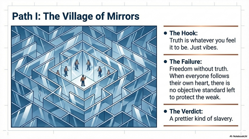 The people greeted him warmly, assuring him that the truth is personal. “Truth,” they said with sweet smiles, “is whatever you feel it to be. Follow your heart. Create your truth.”